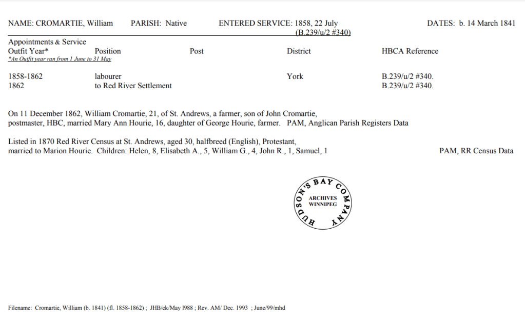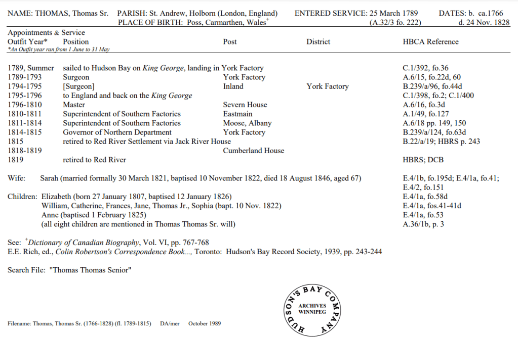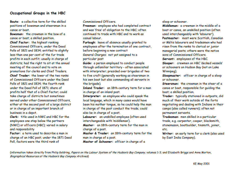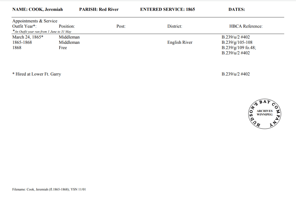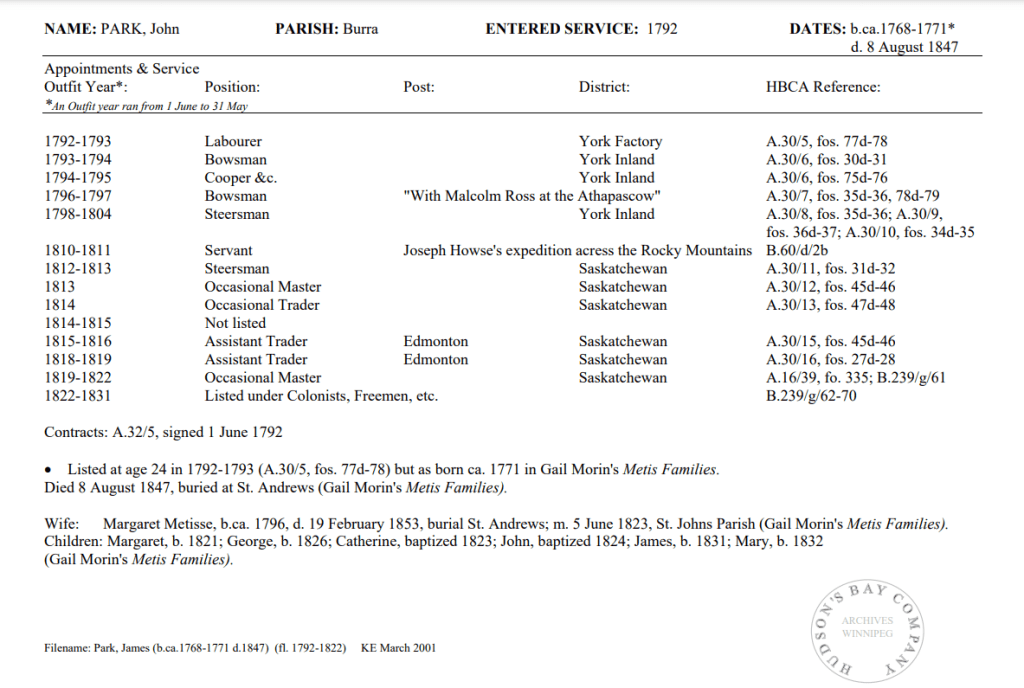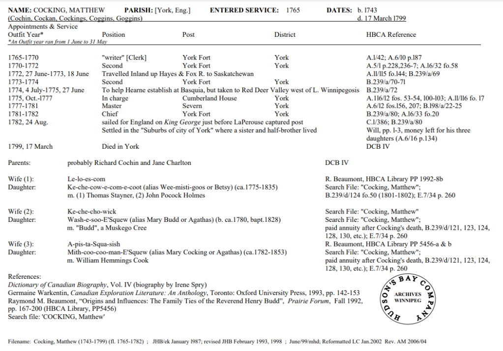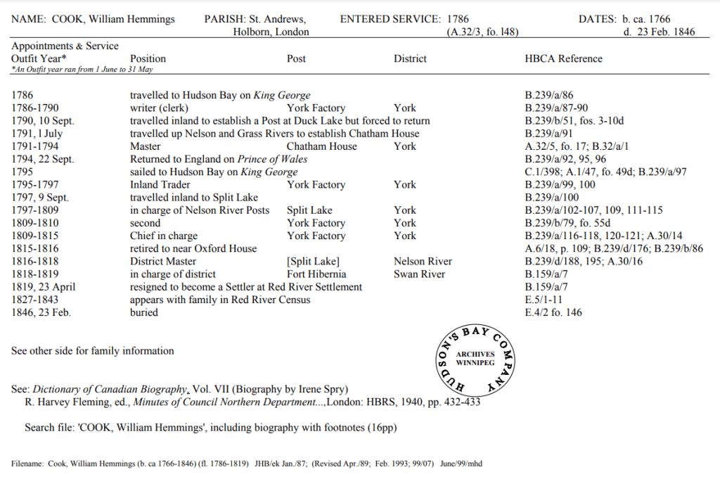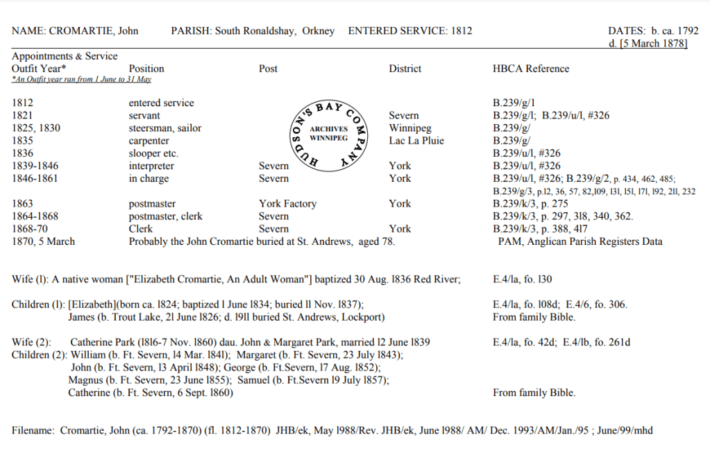 HBC Biographical worksheets are prepared by HBC archivists that capture the work history of some of the employees of the HBC(Hudson’s Bay Company) and also the NWC(Northwest Company). They include the years of service, positions held, family members, and other accomplishments. They are a great resource for anyone from historians to genealogists across the globe.